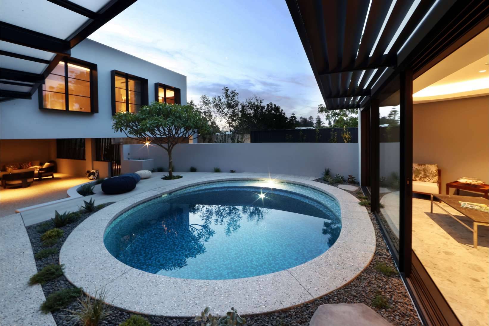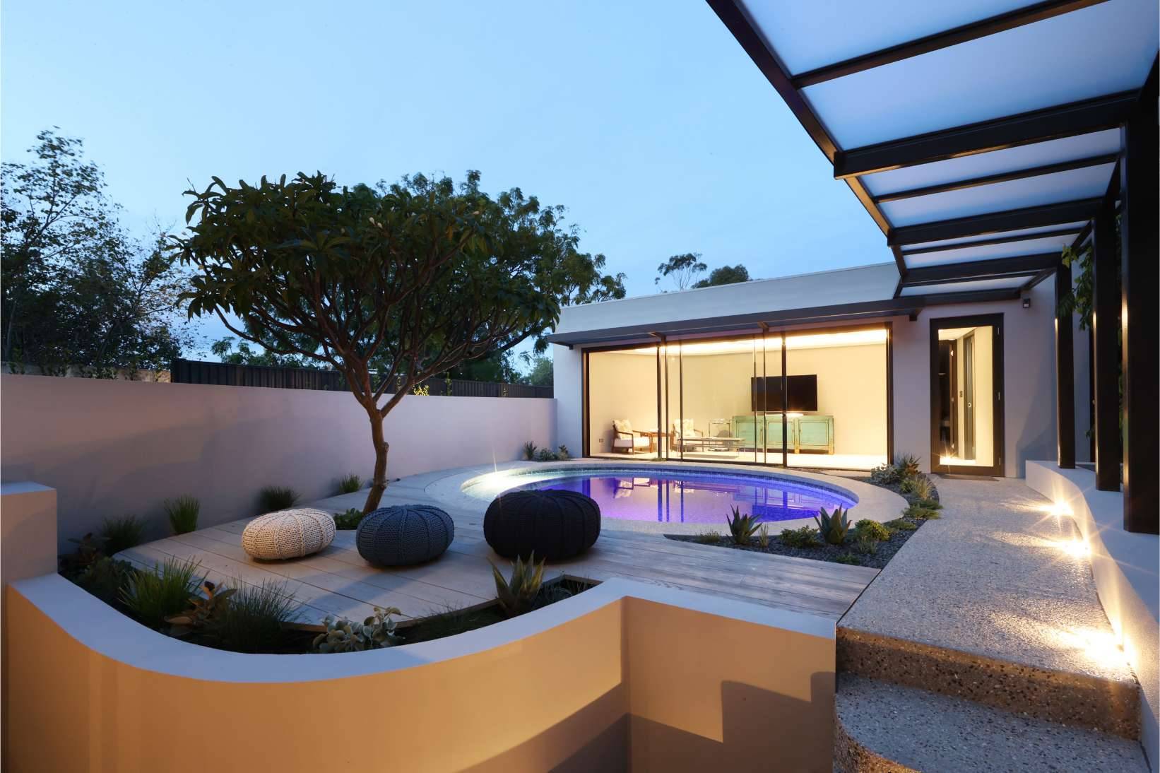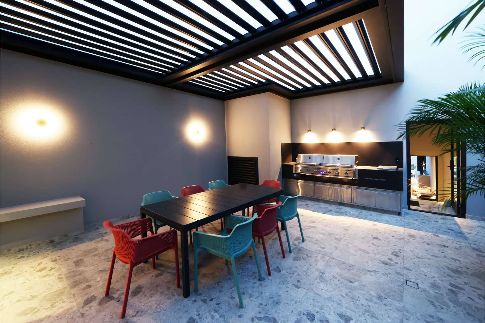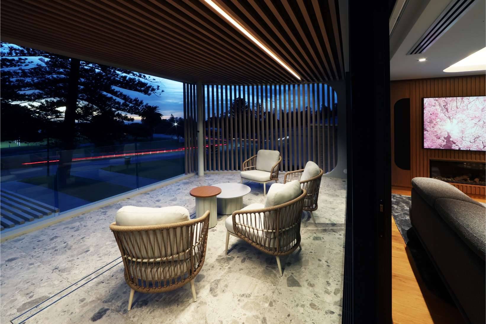 The reimagined ground level opens directly onto a sheltered central courtyard, anchored by a louvred pergola and BBQ facilities—an all-weather entertaining space protected from prevailing coastal winds. A short stair descent leads to a formerly underutilised undercroft, now transformed into a dynamic outdoor zone featuring a landscaped garden, resort-style pool, and integrated Gym Room.