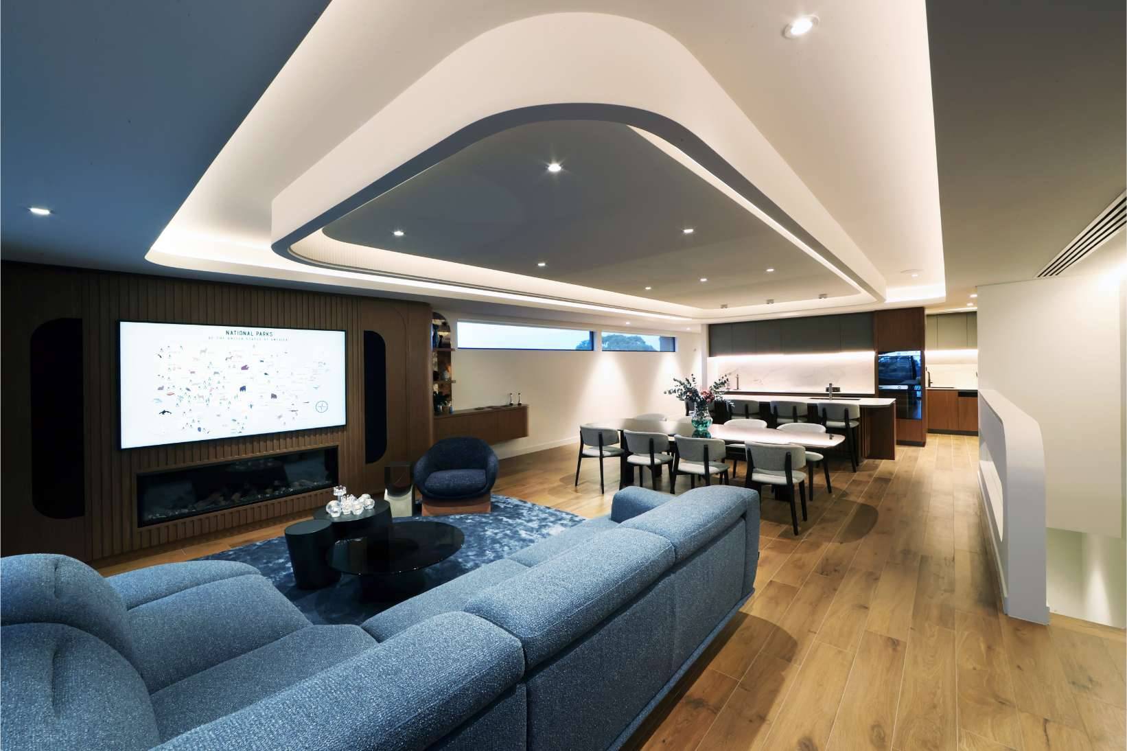 Meticulous attention to detail is evident in every aspect, from intricately designed cabinetry and balustrading to the ceiling’s curved features. The finishes are carefully selected to complement each other, resulting in a practical and sophisticated space perfect for living and entertaining.